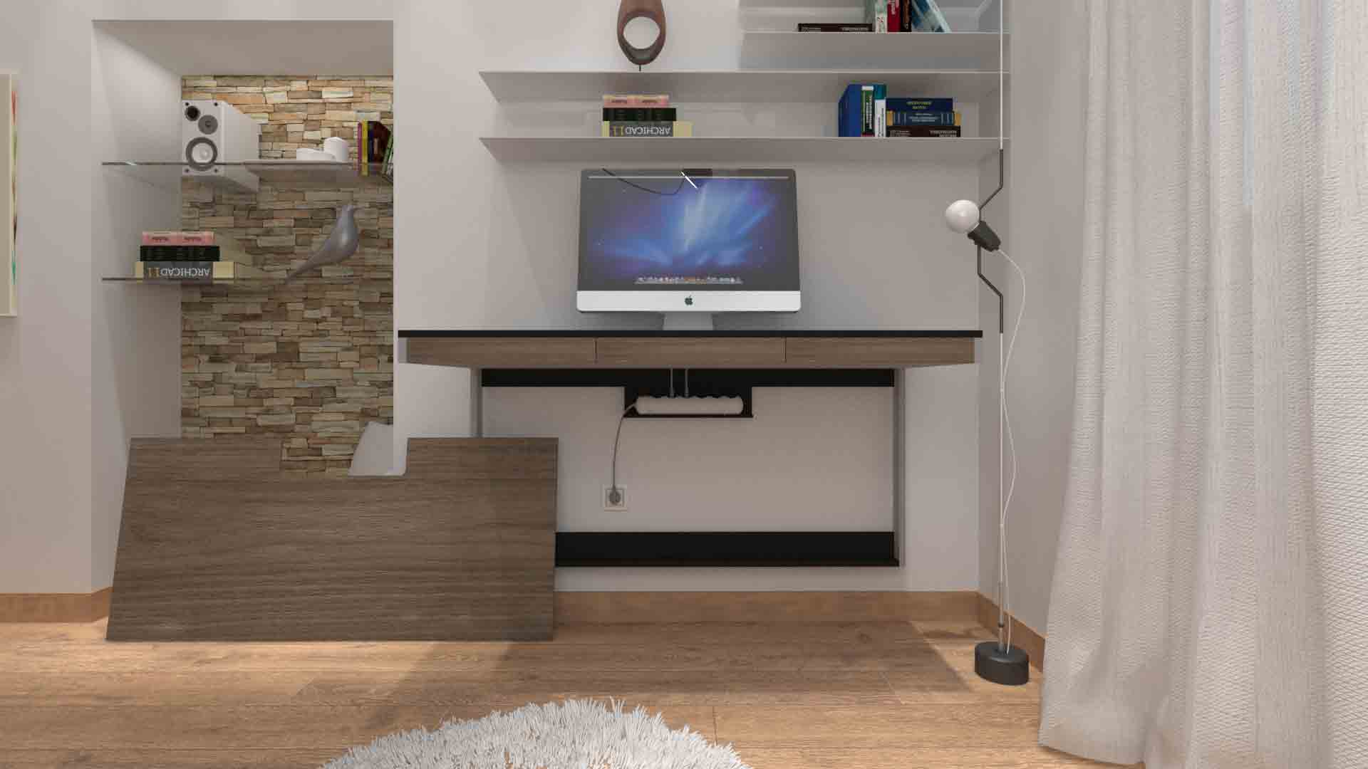 Pisači sto za fiokom za tastaturu, dve fioke i strujnim razvodnikom.